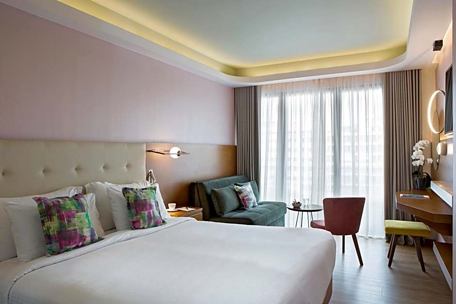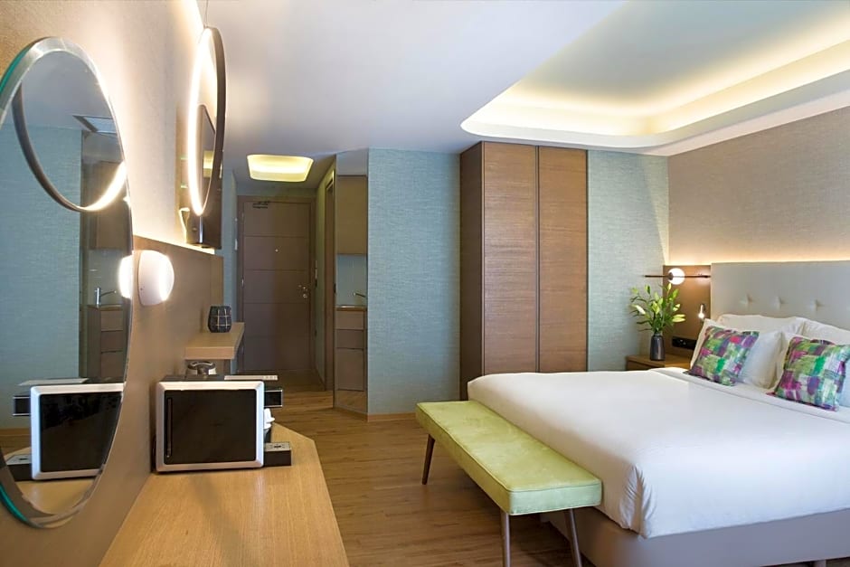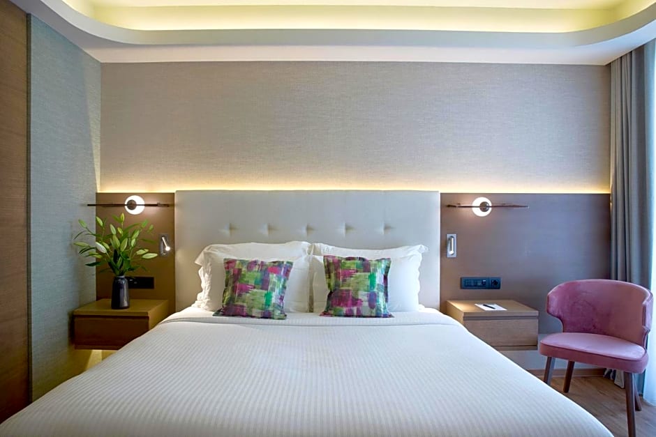 Overlooking hotel's atrium, this room is fitted with parquet floors, neutral tones and Egyptian cotton linens. It comes with a modern bathroom with walk-in shower. Facilities include a laptop safe, ironing amenities, an espresso machine and a plush bathrobe. Please note that bedding type (queen/twin) is upon request and subject to availability.